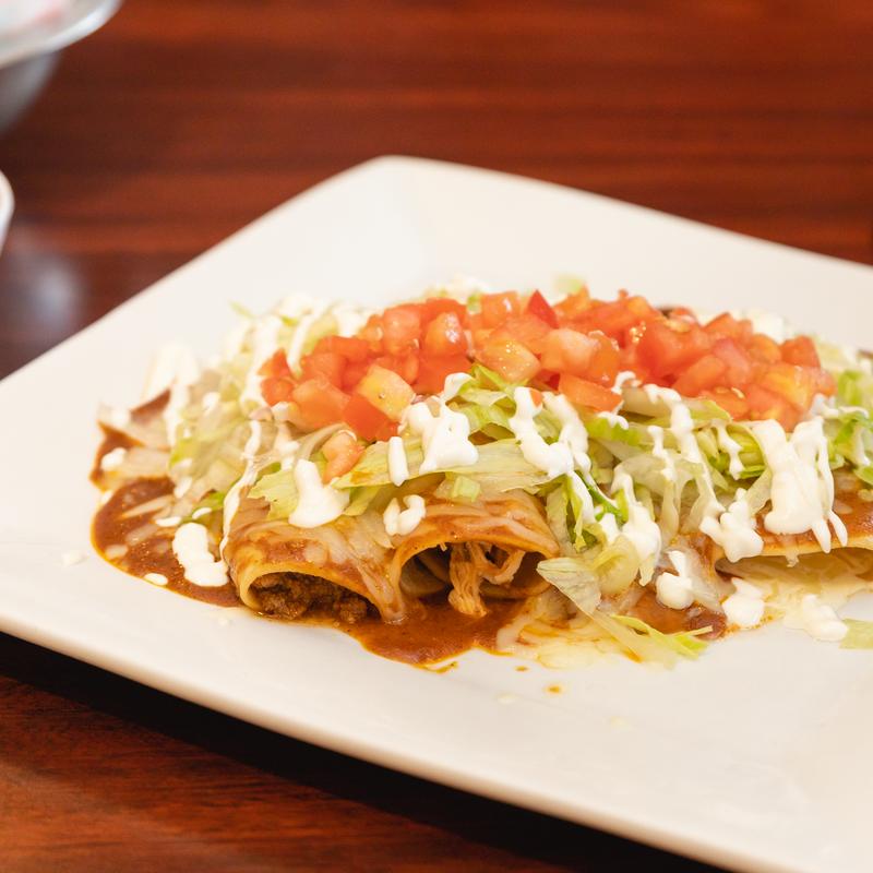 Two Flour Tortillas Fried Crispy And Filled With Beef Tips Or Chicken. Covered With Cheese And Served With Beans And Guacamole Salad. Beef 13.99 | Steak or Grilled Chicken 17.25